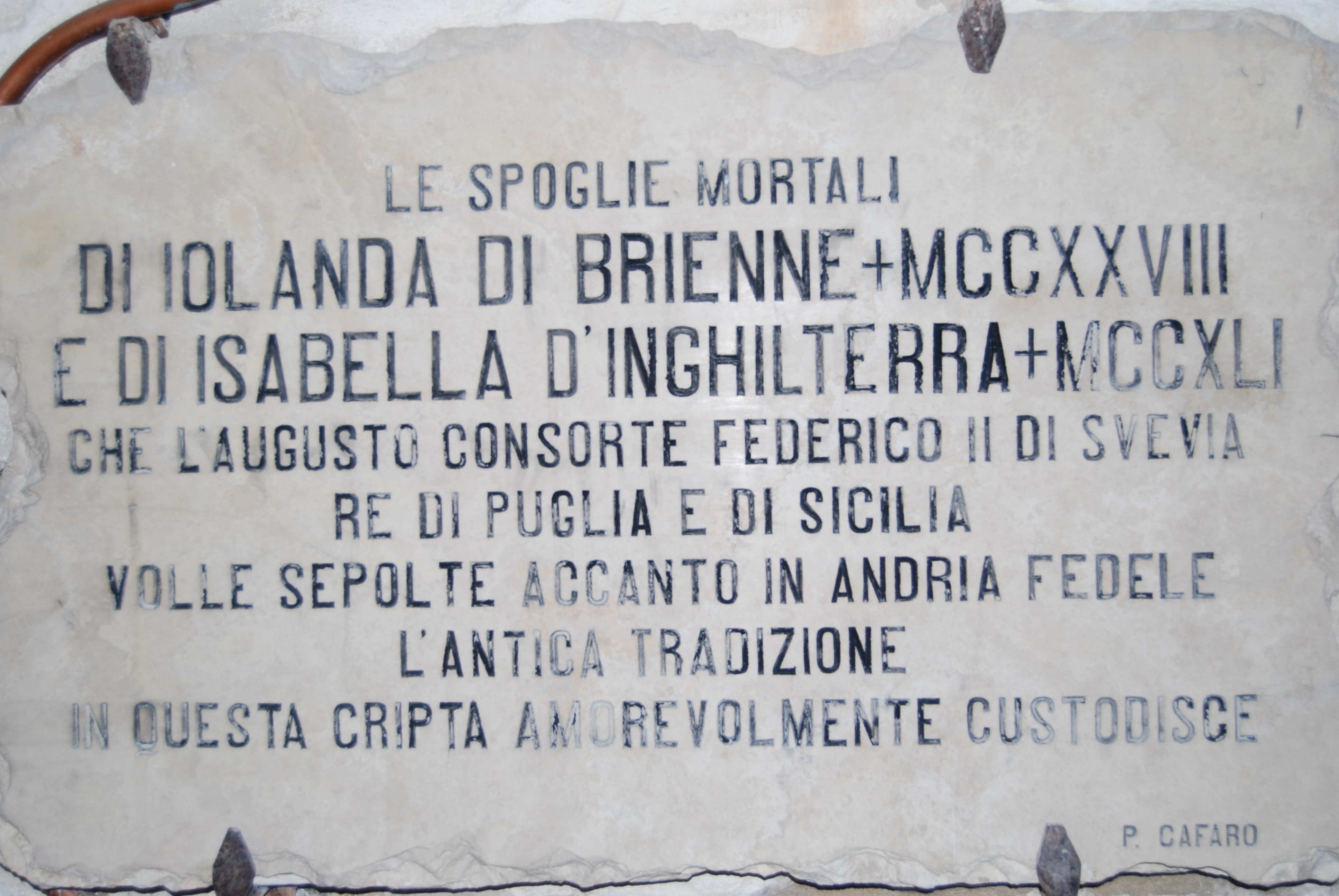 The main church is the Duomo d'Andria, la Cattedrale di Santa Maria Assunta. This was mainly built in the 11th and 12th centuries in Romanesque Norman style, but was extensively modified in later centuries, and renovated as late as 1916 following a fire. It is open 9.30am-12.30pm (except Mondays). Of particular interest is the 7th century crypt, which contains the remains of Isabella of England and Jolanda of Brienne, wives of Frederick II. The crypt is entered via a stairway inside the cathedral. If this is roped off, just find someone to ask and switch on the lights, it is open to the public. However, although the crypt is worth seeing, the actual tombs are not elaborate, just indicated by a plaque.