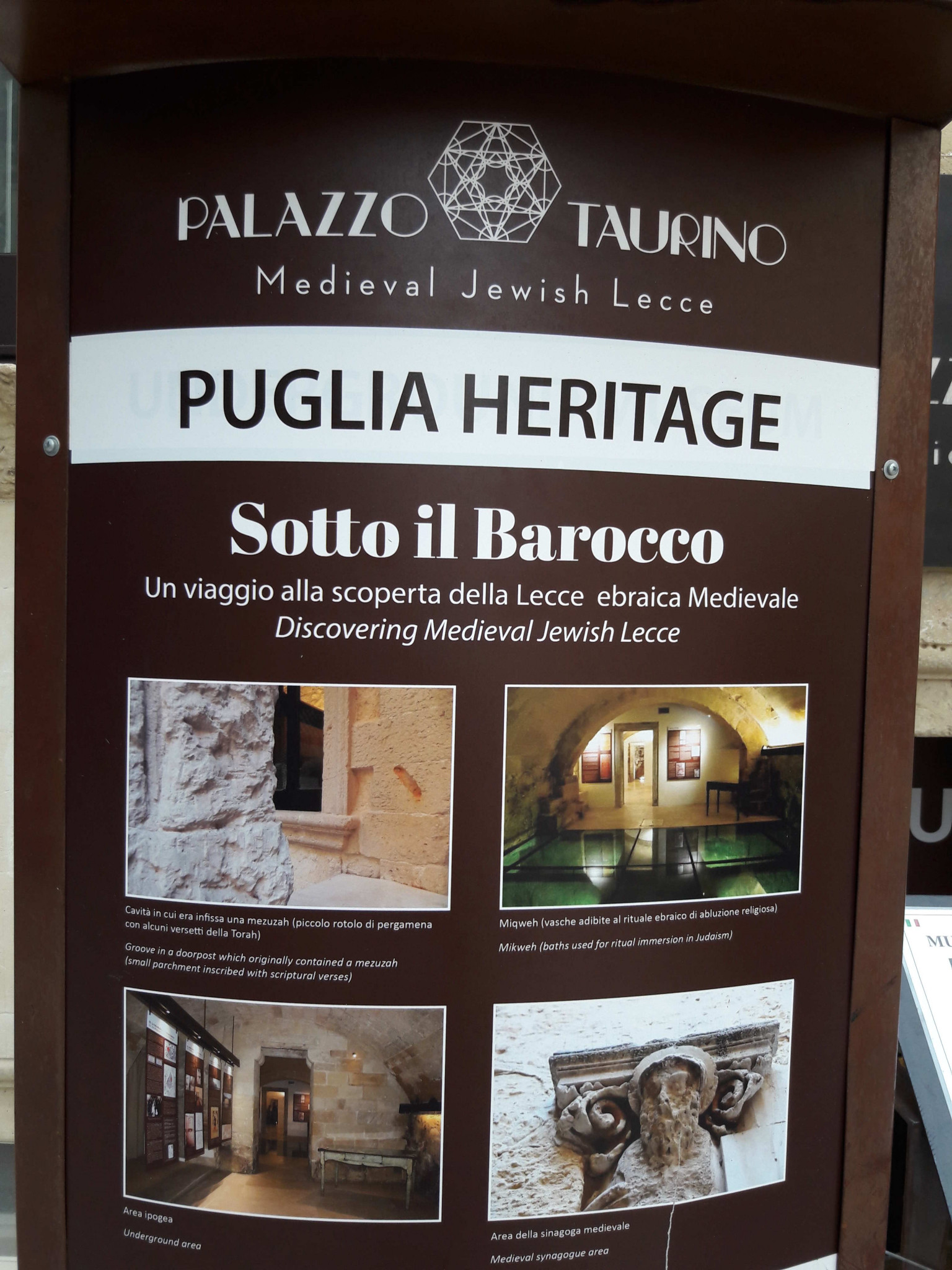 Lecce is a place to wander around and explore casually if you are not a dedicated baroque enthusiast. There are various museums and galleries of course. A new and slightly unusual addition to these is a museum right next to Santa Croce in the Palazzo Taurino, illustrating the Jewish contribution to mediaeval Lecce, a glimpse into life in the city before the baroque period, when Jews were very important in its trading and commercial success. The site is in the basement of an ancient synagogue, with remains of baths fed by the watercourse which runs beneath the city. There are tours in various languages. A short film describes the resettlement camps in this part of Italy in 1945-50, where Jews who survived the Holocaust spent time before moving on (mainly to Israel and America).