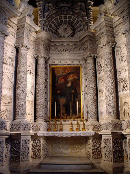 Artistically the most important chapel is that of of San Francesco di Paulo, on the left aisle. Designed in 1614/15 by Francesco Antonio Zimbalo, this has a central altar flanked by decorated columns. Between the columns are 12 sculpted panels describing the life of the saint, and the whole is surmounted by statues of angels and other symbols.