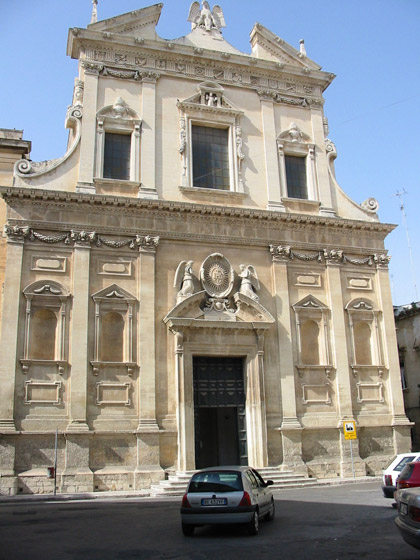 This church overlooks a small piazza on Via Vittorio Emanuele, between Piazza Duomo and Piazza Sant'Oronzo, so it may well be the first major baroque church a visitor encounters. It was built in the period 1591-1639 by Francesco Grimaldi of Turin, dedicated to sant'Irene of Lecce, who was the patron saint of the city until being displaced as such by Sant'Oronzo in 1656. This was the church of a male monsatic order known as the Theatines, which was suppressed in 1866, but with the church left as a place of worship.