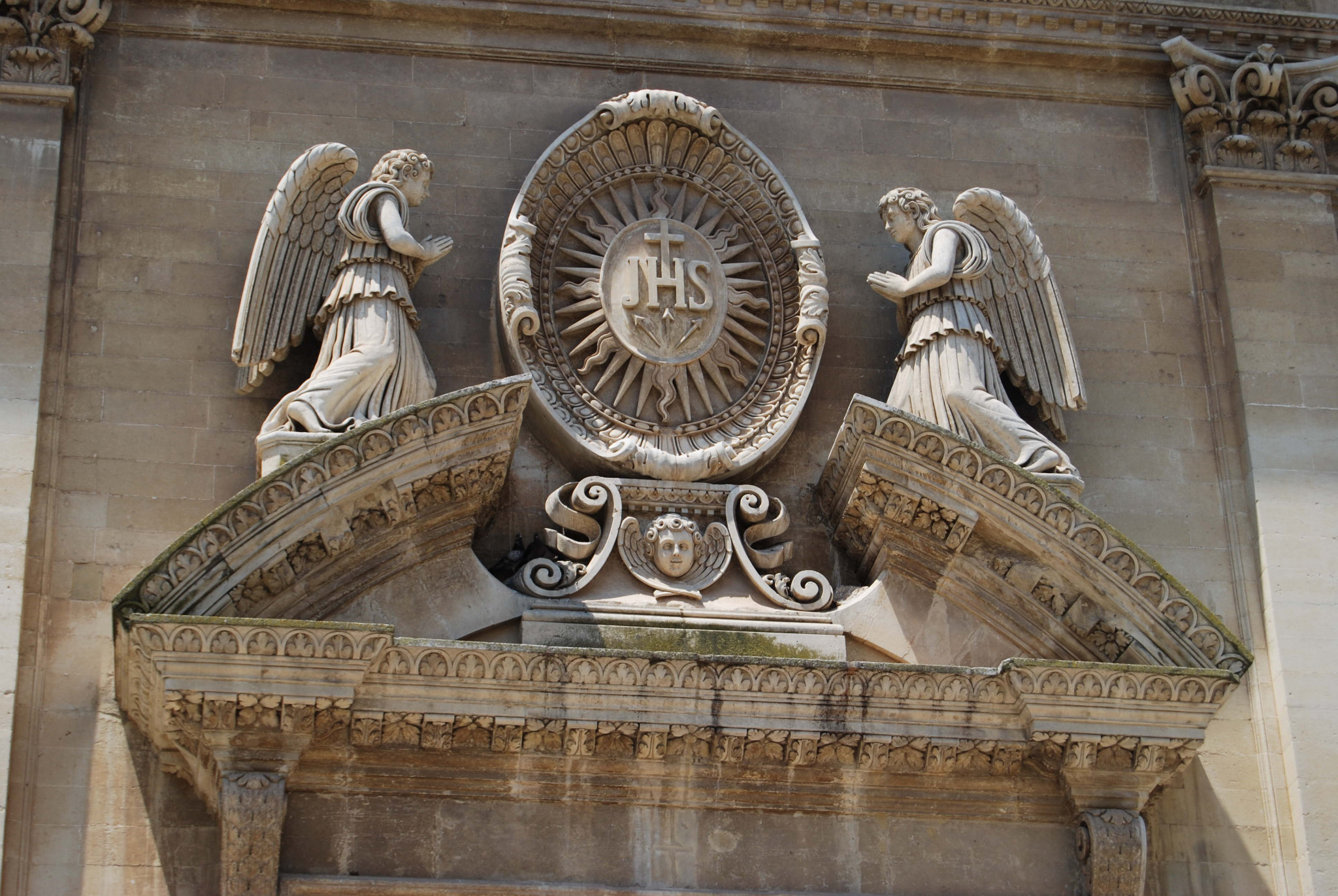 The facade is comparatively restrained in design compared with other churches nearby built a little later. The lower section is a simple pattern of pillars and empty niches. The doorway is surmounted by the Jesuit emblem flanked by sculpted angels. The upper section is has more decorative features and three windows, with a small statue of the Child Jesus over the middle one. The roof pediment is decorated with religious imagery, and capped by a statue of a Pelican, a widely used symbol of a mother feeding its children.