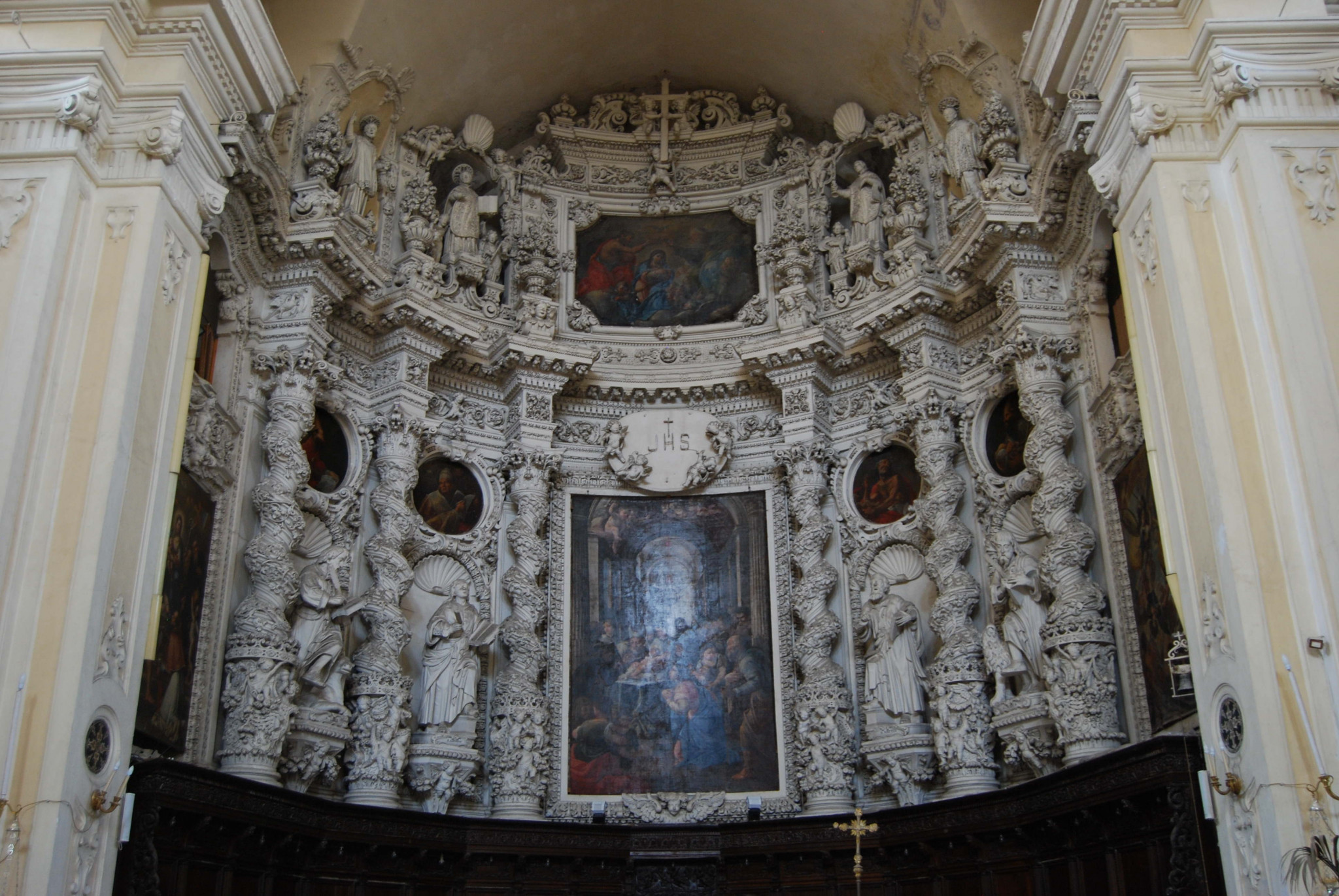 The main altar dominates however. This was created by in the mid 17th century by Guiseppe Cino (the leading Lecce architect of that time, responsible for many of the buildings created then). It is flanked by sculpted twisted columns, and contains a painting of the Circumcision by Jacopo Robusti. There  are various sculpted figures, statues and paintings, all contributing to a magnificent overall impact. The wooden (walnut) stalls at the base were an 18th century addition and are attractively decorated with flowers and others symbols.