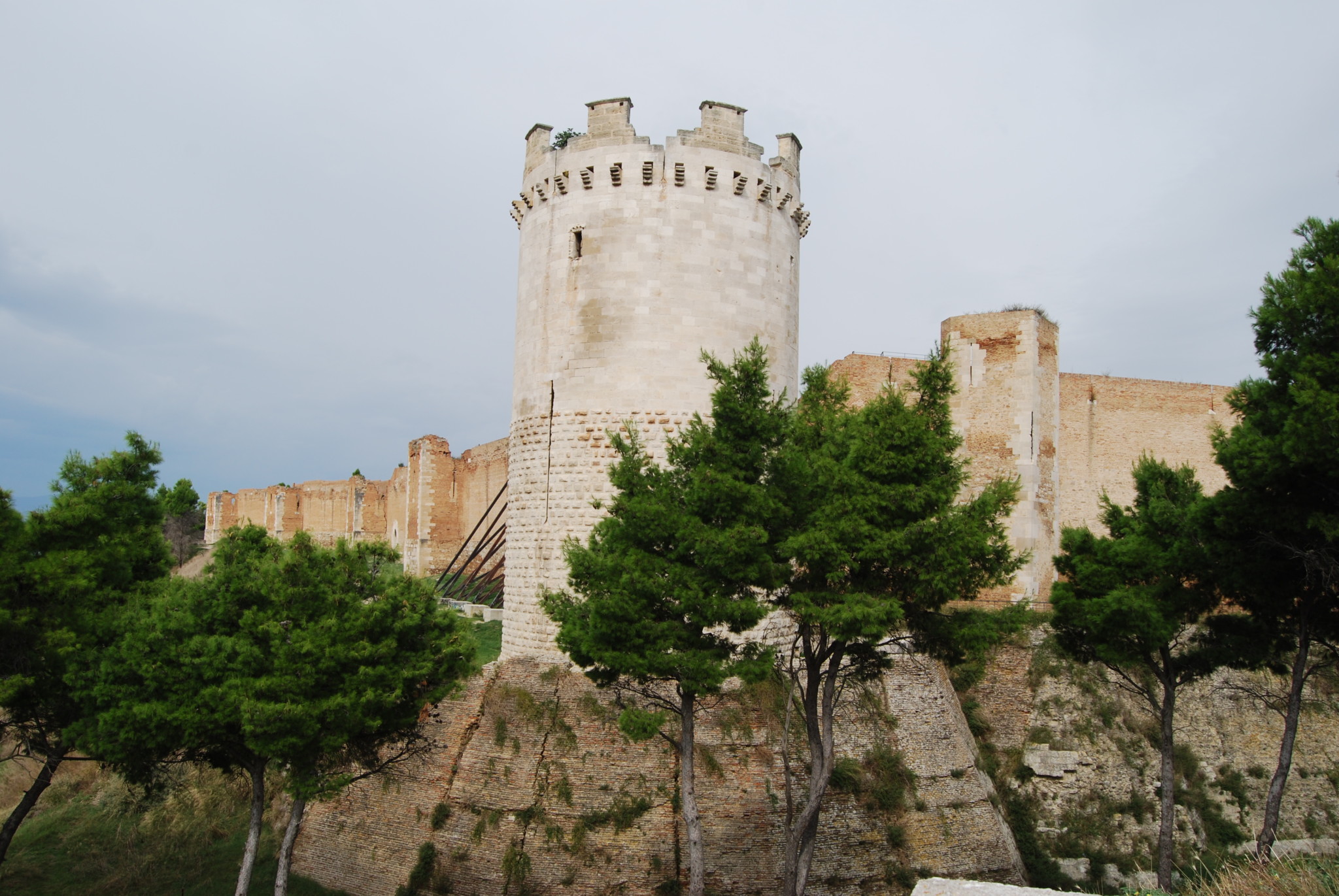 The Castello (known as la Fortezza Svevo Angioina - the Swabian-Angevin Fortress) is located in a dominant position about 500 metres to the west of the centro storico (you can get a good view from the Villa Communale). Although it is largely a ruin, mainly just the external walls, it is enormous. It can be visited and is well worth going to see. The scale of the building once inside its walls is dramatically evident.