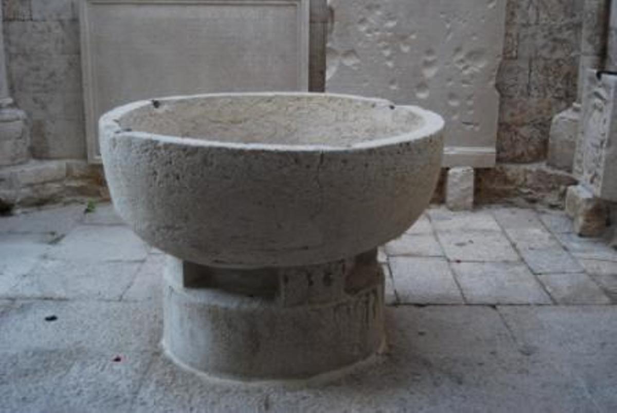 The main building in the Centro Antico is the imposing Romanesque Duomo, dedicated to the patron saint of Molfetta, San Corrado di Baviera, whose bones are on display. The Duomo was originally constructed in the 11th century but extended and modified extensively afterwards. It has two very distinctive towers (one a bell tower, the other a watch tower) and three different shaped domed cupolas. The site overlooking the sea and the large port area allow it to rival the cathedral in Trani as a coastal landmark. Internally it is traditionally austere, with three naves; side chapels date mainly from the 15th and 16th centuries. The columns and chapels are decorated with interesting carvings of animals and plants; and also on display is a 12th century font.