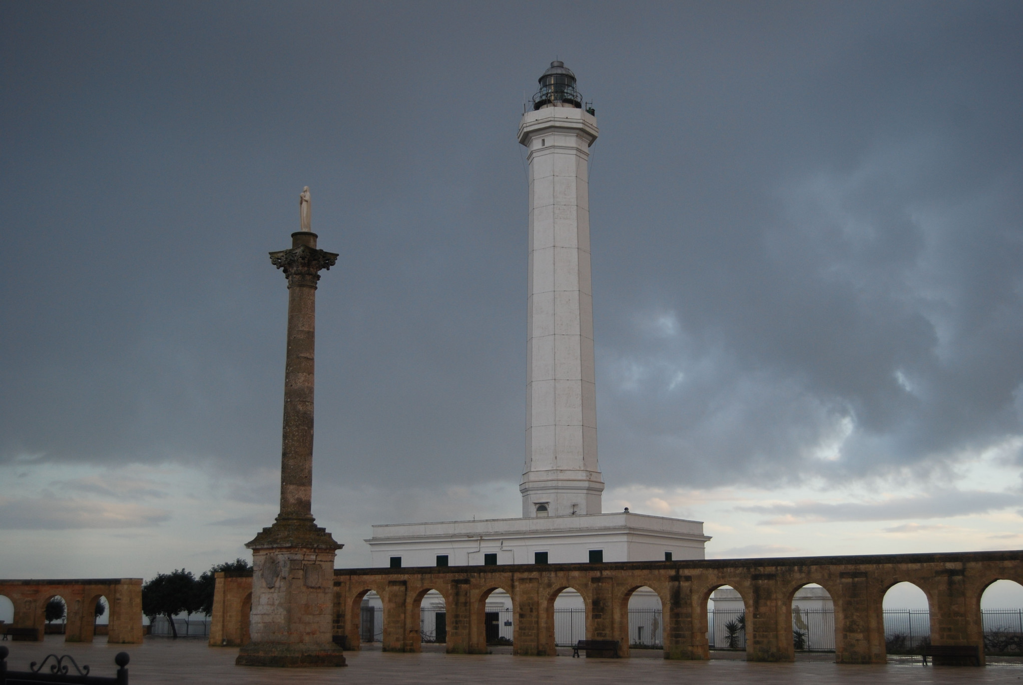 The juxtaposition of the lighthouse looking out to sea and the column topped by a statue of the Virgin Mary looking inland gives this spot a significant atmosphere in sunny weather but even more so when the sea is rough and the sky ominous.
