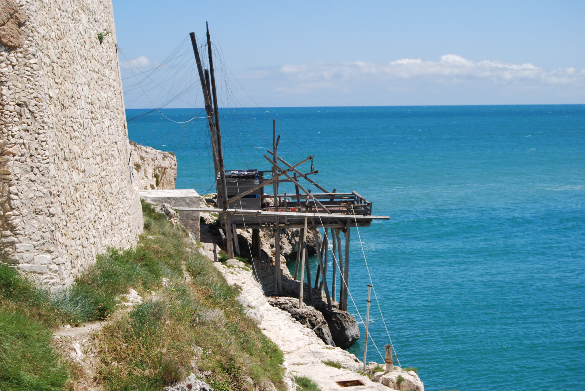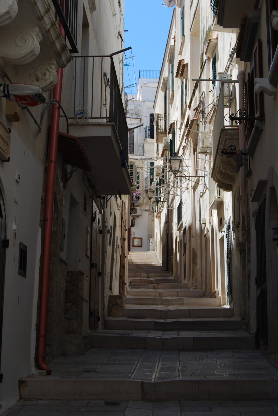 There is a particularly beautiful walkway from the church, looking down to the sea and up to the centro storico. This path leads into the centro storico, where you can walk up through narrow streets to the Castello, a triangular fortress on top of the headland, another construction of Frederick II. It is a military establishment, closed to the public, although we have seen reference to guided tours in the evenings and it is used as the venue for special events. Unlike many similar castles in Puglia it is difficult to see much of its substantial exterior. The castle was damaged by shells from an Austrian warship on 24 May 1915, the day Italy entered the war.